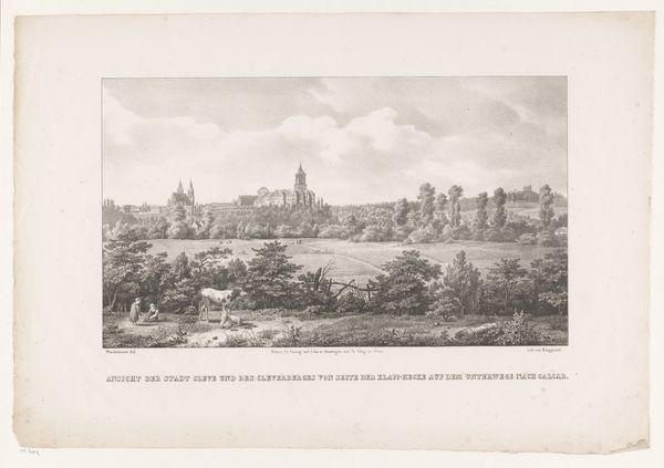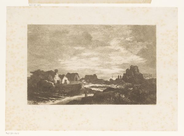 This aquatint, "View from Palace Terrace at Saint Germain on Laye," was etched in ink on paper by the British artist Thomas Girtin in the late 1790s or early 1800s. Aquatint is an intaglio printmaking technique, related to etching, and was used by artists to create tonal effects by applying powdered resin to a metal plate and then exposing it to acid. The acid bites around the resin particles, creating a textured surface that holds ink. When printed, this technique gives the image a grainy, watercolor-like appearance. Girtin skillfully captures the serene landscape of Saint Germain on Laye. Notice the subtle gradations of light and shadow, achieved through the aquatint process, giving depth and atmosphere to the scene. This print reflects the era's fascination with picturesque landscapes, but also speaks to the growth of print culture and the commodification of art. Prints like these made art more accessible to a wider audience, fostering a growing appreciation for landscape and the aesthetics of the natural world, beyond the walls of palaces.