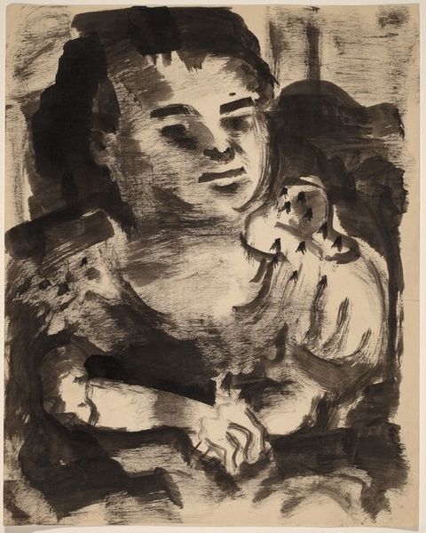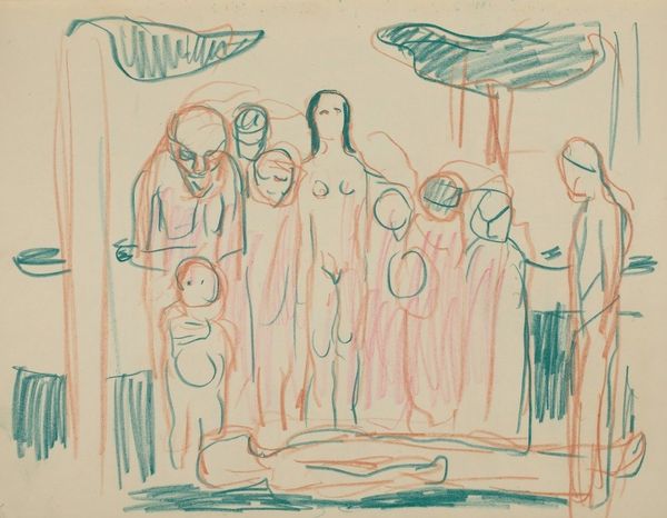 Curator: This work, titled "König," was created by Christian Rohlfs in 1910. It’s rendered with ink and watercolor on paper, exhibiting traits of German Expressionism. Editor: At first glance, there's a raw, almost childlike quality to it. The king feels massive, dominating the frame. The linework is bold, assertive. Curator: Absolutely. Rohlfs utilizes these seemingly simple lines and washes of color to convey a great deal. The figure of the king resonates with symbolic weight that dates back centuries. Royal regalia has always represented political, and sometimes even, divine legitimacy. Editor: Note the angularity in the crown. It's almost violently positioned atop his head. Even the staff held aloft possesses a starkness that denies any easy interpretation of power. The choice to use watercolor here—typically associated with lightness and delicacy—lends an unsettling instability. Curator: But this “instability”, as you call it, resonates perfectly with Expressionist concerns. Remember the era: growing social anxieties, and challenges to established authority are mirrored here in the collapsing form of the ruler, even as the crown asserts itself visually. The subject below him offers homage, it's clear, but what's missing? He appears powerless. Editor: The application of color seems almost haphazard. It rejects any sense of depth, opting instead for a flattened picture plane. The black outlines trap the washes of color, further reinforcing the image’s constructed nature, devoid of representational ambitions. Curator: Right, it’s less a representation and more an embodiment of a concept – the fraying of tradition. The viewer becomes privy to the underlying psychological state of a society questioning itself, all filtered through the artist's interpretation of kingship. Editor: Ultimately, I think this “König” fascinates precisely because of its artifice, its awareness of its own materiality as much as its purported subject. The intentional crudeness, rather than diminishing it, intensifies its message. Curator: Indeed, what strikes me most is how Rohlfs manages to imbue "König" with a timeless relevance, tapping into the eternal themes of power, submission, and the anxieties inherent in any established order. Editor: Agreed. It's a deceptively simple work concealing depths of thought.