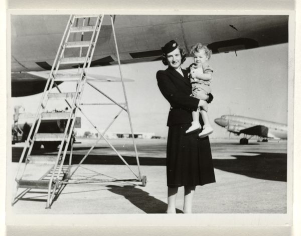This vintage photograph shows Isabel Wachenheimer in her KLM uniform, standing with a child in front of an airplane. The grayscale tones give a sense of distance, pulling us into the past, and the composition is carefully framed. The textures of the metal and fabric are palpable, but it's Isabel's expression that grabs me. Holding the child gives a humanising sense of intimacy. The shadow over the child's face contrasts with their light clothing, suggesting the possibilities and risks of new opportunities. It makes me think about the intersection of personal and professional life, and how the artist has created a moment that resonates across time. Like the photography of Lisette Model, this photograph plays with ideas of representation, blurring the lines between documentary and portraiture. It invites us to consider the stories behind the images, recognizing that art is a conversation, not a monologue.