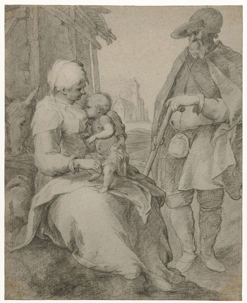 This small drawing of a group of figures was made by Cornelis van Noorde in the 18th century, using graphite and grey wash on paper. The subtle gradations of tone reveal a careful process; the artist would have applied delicate layers of diluted pigment to build up depth and shadow. This technique, known as ‘wash’, was popular at the time for its ability to mimic the effects of oil paint, but with a more immediate, sketch-like quality. The softness achieved here lends a sense of intimacy to the scene, capturing a fleeting moment of familial interaction. Van Noorde likely trained as a printmaker, as his fine lines and attention to detail suggest. The use of humble materials elevates this intimate scene, making it accessible. This artwork blurs the boundaries between everyday life and fine art, reminding us that the value of art lies not only in its materials but also in its ability to capture and communicate human experience.