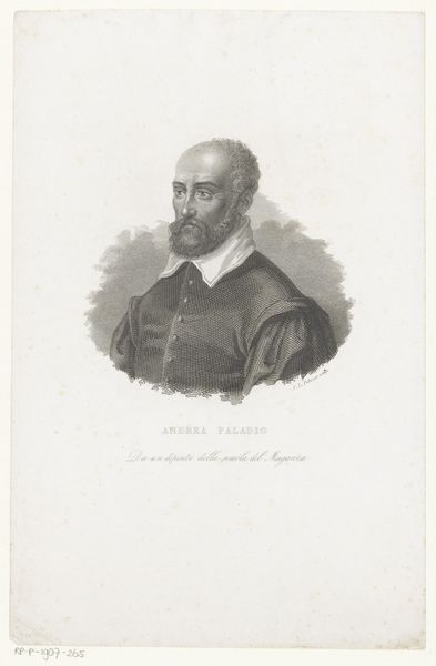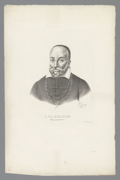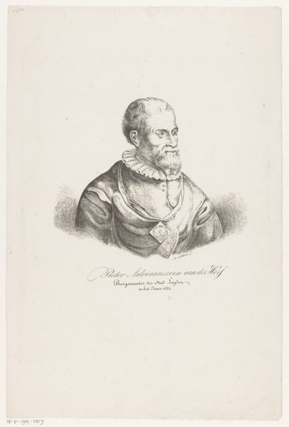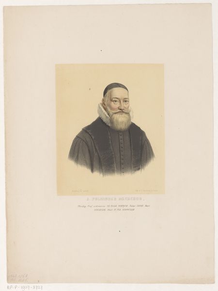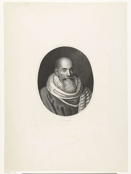 Curator: There’s something quietly intense about this portrait. A penetrating gaze and almost scholarly calmness—or perhaps stoicism? Editor: Indeed. Here we have Leendert Springer’s rendering of *Portret van Jacobus Arminius*, a print created around 1850. Arminius, the subject, was a Dutch theologian whose ideas sparked considerable debate in the Reformed Church. Curator: A man of ideas then! It figures, he has that kind of… thoughtful brow? I get a sense of the weight of religious and political burdens in those eyes. It's as though he is wrestling with complexities most of us wouldn't dream of, right in the thick of it, even if Springer rendered the print several centuries after the original man died. Editor: Absolutely. Understanding Arminius' historical context illuminates the artwork itself. He challenged predestination, advocating for free will, and Springer captures this tension subtly, conveying a kind of inner strength alongside an intellectual weight. Look at the color: the somber greys, set off by the gold tones in his fur lining. This piece is about power. Who wields it and why? Curator: You know, seeing it that way… makes the ruff almost a little ironic. A delicate touch for a robust figure. Editor: Perhaps Springer subtly implies something there—a commentary on social constructs, linking appearance with the challenging figure portrayed, almost daring us to look closer at the historical context surrounding the man. It brings to mind Judith Butler, actually. Curator: Intriguing, definitely food for thought. Something to unravel, layer by layer, I think, about faith and how power rests within individuals—even under immense pressure to fall into line. I bet you have many of us pondering exactly that for hours. Editor: One can only hope, to inspire others to dig beneath the surface and question established views, just like Arminius himself!