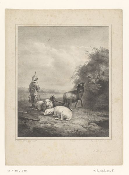 Curator: Augustin Mongin's etching, "Landschap met rustende schapen en geiten," or "Landscape with Resting Sheep and Goats," likely created between 1853 and 1911, presents a tranquil pastoral scene rendered in ink on paper. Editor: It does evoke a sense of calm, doesn't it? There’s a softness in the light and the way the animals are clustered together that suggests a refuge from the outside world. But something about the goat standing separate feels significant. Curator: Indeed. Consider how rural genre paintings functioned within the context of rapidly industrializing societies. There’s often an idealization of rural life embedded, a nostalgic look back at agrarian rhythms in contrast to urban chaos and exploitation. The image could represent an appeal for social and political reform or perhaps comment on the economic landscape. How are we valuing manual labour and natural life? Editor: It is interesting to view the political context as an additional layer of analysis here. For the artist, choosing this subject in itself, situates the artwork squarely within debates concerning societal structure and resource allocation of that time. Are the working classes being forgotten? Are rural life values worthy? Curator: The etching technique itself also speaks to a specific history – printmaking democratizing image distribution, allowing for broader social access to art and ideas. It’s less about unique artistic genius, and more about disseminating messages widely, challenging the elitist consumption of art. Also the material condition is not very fine art, so speaks more to art being available to the common classes of the time. Editor: And thinking about it today, these images are consumed very differently by people as many seek nostalgia. It's a reminder that interpretations evolve alongside social and technological changes. Perhaps now it serves as a gentle reminder of simpler times as we face a climate crisis that may disrupt modern lifestyles, which serves as an entry-point to discuss human impacts on our ecosystems. Curator: A potent point. Considering it now, Mongin’s landscape acts as both a historical document and an instigator for contemporary conversations. Editor: Exactly. It reminds us how art's meaning shifts across time.