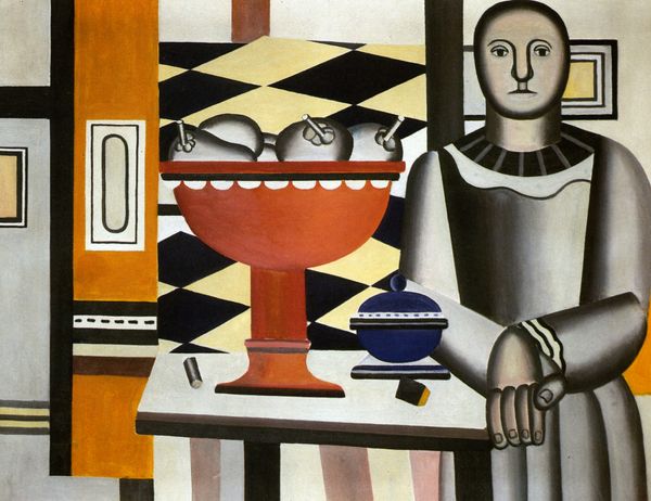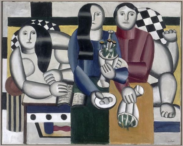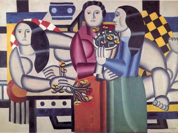 Fernand Léger made this oil painting, Les trois femmes au bouquet, with a devotion to geometric forms and pure, saturated colours. The painting's surface is smooth, almost machine-like, with a precision that echoes industrial design. Look closely, and you'll see the way Léger renders the figures with bold, simplified shapes—cylinders for arms, cones for breasts. This almost robotic approach to the body has a weird allure. It's like he's building people out of spare parts, yet they still manage to hold flowers! I love how he uses these solid blocks of colour to define space and form, almost like a 3D collage. Léger and the German artist, Oskar Schlemmer, both shared an interest in the figure as machine. But where Schlemmer focused on dance and performance, Léger kept his robotic figures still, as if they were always pausing for thought. It's a fascinating conversation about the human form in the age of technology.