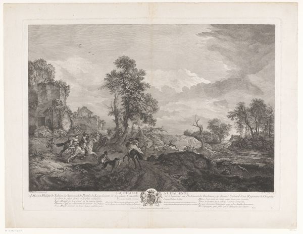 Richard Houston created this print called 'Landschap met vissers en herders bij Châtelain' sometime in the 1700s using etching and engraving techniques. It offers us a window into the 18th century’s vision of rural life, filtered through the lens of an engraver working in London. Houston's print translates a scene likely composed by Jacques Philippe Chatelain, focusing on labor, livestock, and land. It reminds us that the pastoral scenes so popular at the time weren't just pretty pictures; they were deeply connected to economic realities and the lives of working people. How did these images shape the way society viewed the working class? This piece also invites us to consider the absence of certain narratives. Where are the voices and stories of those who toiled on this land? What were their experiences, their struggles, and their joys? Ultimately, this print acts as a reminder to look critically at the stories we tell ourselves about the past, and whose voices get amplified.
