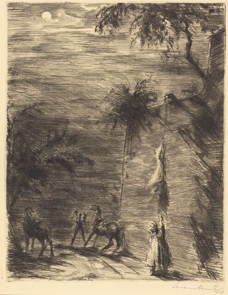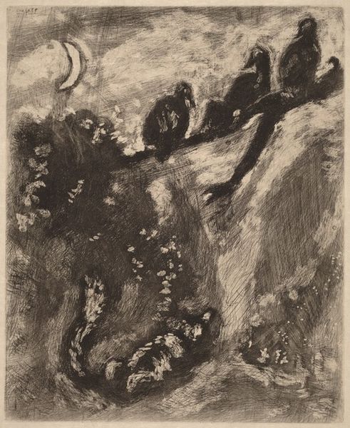 Editor: This is "The Little Fish and the Fisherman" by Marc Chagall, made sometime between 1927 and 1930. It's an etching, so printed on paper. There’s almost a dreamlike quality to the composition… I’m struck by how the fisherman and fish seem equally prominent. What do you make of this etching? Curator: This etching resonates deeply with universal, almost archetypal, narratives of pursuit and consequence. Look at how Chagall doesn't simply depict a fishing scene. It's loaded with symbolic weight, isn’t it? Consider the fisherman's oversized profile against the smaller, vulnerable fish. What emotional power dynamic do you see? Editor: Well, at first glance, the fisherman appears dominant. But the fish is centered and seems almost… defiant? Is Chagall questioning traditional power structures? Curator: Exactly! Think about the historical context. Chagall, like many artists of his time, wrestled with themes of displacement and identity. The fisherman, traditionally a figure of authority, here could symbolize oppressive forces. The fish? Perhaps the individual spirit fighting against those forces. The water rendered so turbulent— is it just water or emotional turmoil? Editor: That makes me think of the tree in the upper left corner, bare and almost clawing at the sky. It echoes that feeling of struggle. Curator: Precisely! Everything contributes. The very act of etching, scratching into the plate, mirrors the often painful process of carving out one's existence. It invites us to contemplate the eternal dance between hunter and hunted, the powerful and the vulnerable. Editor: It’s amazing how much narrative Chagall packs into what seemed, at first, like a simple scene. Curator: And it demonstrates the lasting resonance of visual symbols across time. Even a seemingly simple image carries echoes of cultural memory and shared human experience.