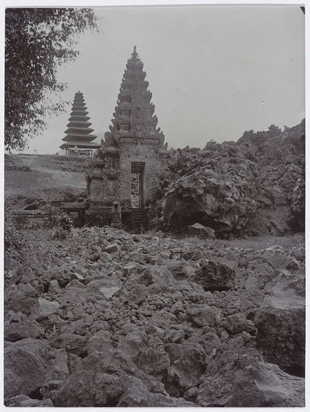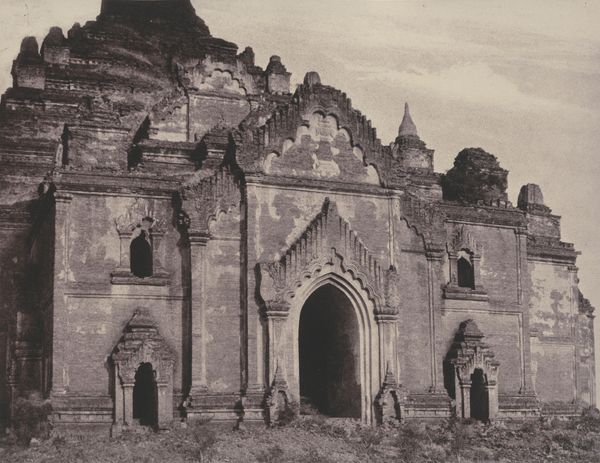Editor: So, this is Linnaeus Tripe’s “Pugahm Myo: Entrance to the Shwe Zeegong Pagoda,” a photograph from around 1855. It's a beautiful monochrome print. It feels so serene and ancient, almost like stepping back in time. What captures your attention in this image? Curator: The photograph provides a vital lens through which to consider British colonial interventions and their impact on cultural heritage. Linnaeus Tripe, as part of the British East India Company, was not just documenting, but participating in a power dynamic. How do we reconcile the aesthetic appeal with the embedded colonial gaze that framed the narrative of Southeast Asia for a Western audience? Editor: That's a perspective I hadn't fully considered. I was mainly thinking about the artistic choices, the composition and how the light falls. Curator: The visual elements are strategic. Notice the scale and positioning of the pagoda, which seems to monumentalize imperial ambitions by capturing this ‘exotic’ place. By focusing on supposedly untouched ruins, the Empire reinforced a vision of cultural superiority, suggesting their stewardship was necessary. How does this interplay between image and implied power impact your understanding now? Editor: It makes me rethink the romantic idea of just a serene landscape. There's a whole story about power dynamics encoded in the image. It becomes a historical document, not just a piece of art. Curator: Exactly. Considering the social context is essential. These early photographs played a significant role in shaping Western perceptions. And while these images hold artistic merit, we must contextualize them within the framework of imperialism to really grasp their impact. Editor: Thank you! I’m definitely looking at it in a completely new way. It’s much more complex than I initially thought. Curator: Indeed. Recognizing these layers encourages more responsible and informed appreciation.