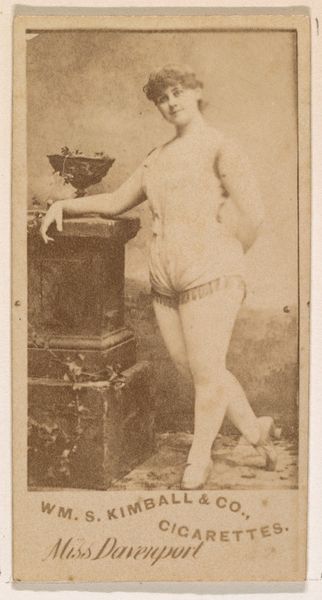 Curator: Looking at this image, I’m struck by how much it seems to play with notions of exoticism. Editor: Yes, I felt it too when I first saw this. I find the composition intriguing—a sepia-toned figure, reminiscent of early photography. Who are we seeing exactly? Curator: We are viewing “Mlle. Dauville, Paris, from the Actors and Actresses series (N171) for Old Judge Cigarettes,” dating from around 1886 to 1890. It's a print drawing produced by Goodwin & Company. The image shows the actress dressed in costume, presumably from a performance. The item itself, though artistic, existed as trade advertising, distributed with cigarette packs. Editor: Right. So the symbols, then: what’s going on with her costume? Is she an Amazonian warrior or perhaps evoking a sense of French colonial fantasy? It's such a simplified rendering, yet the details—the textured skirt, the staff, the large hat—seem loaded with implications. Curator: Exactly. I think her depiction has less to do with ethnographic accuracy and much more to do with constructing and reinforcing the public's perception of female identity and "the Other" at that time. What narratives are subtly enforced, as well as which hierarchies, and to what effect? Editor: Absolutely, the pose, the "primitive" costume--it all seems calculated to evoke a specific set of assumptions and expectations. It is telling that a generalized exotic image like this one helped to sell cigarettes and that consumers related so quickly. Did they desire to go on similar “adventures”? Did they already have some fixed beliefs about Parisians? Curator: Consider, also, the male gaze in constructing the performance persona. What does the male ownership of a cigarette product like "Old Judge" tell us about how the advertisers saw their audience? Or more particularly how it relates to broader ideas about women, public image, consumption, and desire? This seems like a window onto gendered socio-political dynamics during the period of imperial expansion. Editor: I see what you mean; reading it as a lens for understanding the gender politics interwoven with the product promotion. So, much more than a picture promoting cigarettes. A powerful symbol for studying both gender roles and commodity consumption! Curator: Indeed. When you think of how many of these cards were produced, consumed, traded, you understand that each one helped consolidate not just a commercial image, but also a societal understanding. Editor: Thank you. It provides such a great insight!