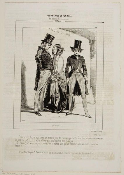 Editor: This is Paul Gavarni's "Hôtes légers des rêveries de jeunes filles . . ." a drawing with no specified date at the Harvard Art Museums. The couple seems to be trapped in a stilted performance of wealth. How do you interpret the work? Curator: I see Gavarni critiquing the performative aspects of bourgeois marriage and gender roles in 19th century France. Notice how the woman's face is obscured and the man is adorned in exaggerated attire, rendering them almost caricatures. What does this image tell us about the social expectations of women at the time versus men? Editor: It’s interesting to see the man so prominently displayed. It makes me think about power dynamics. Curator: Exactly. Gavarni is encouraging us to question these power structures, highlighting the social constraints placed upon women within this particular class. We can think about how similar issues of representation persist today. Editor: That definitely gives me a lot to think about. Thank you.
