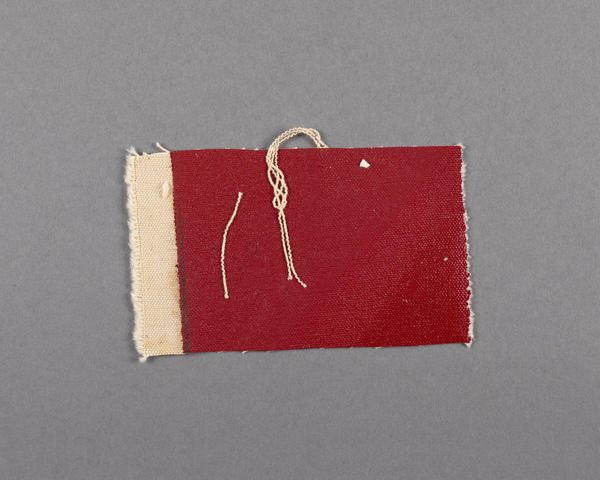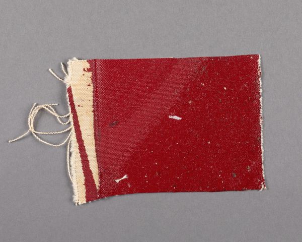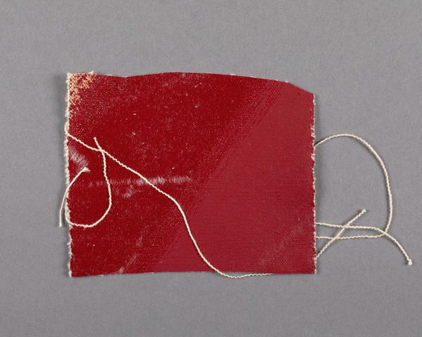 Editor: Here we have Barnett Newman's "Painted canvas fragment." It's small, raw, and intensely red. What can you tell us about it? Curator: It's fascinating how a discarded fragment reveals Newman's process. Consider the labor involved in preparing the canvas, the application of the paint. This wasn't just artistic creation; it was material production. The ragged edges and stray threads challenge traditional notions of a finished artwork. Editor: So, it's not just about the aesthetic, but also about the physical making? Curator: Precisely. This fragment highlights the materiality of art, the means of production, and blurs the lines between high art and craft. Its value lies in its testament to the artist's hand and the context of its creation. Editor: That's a completely different way of seeing it. Thanks!