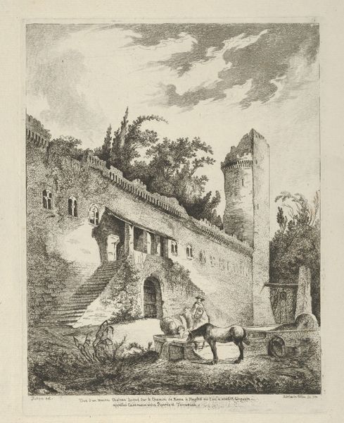 Curator: Up next, we have "View of an Italian Villa," an etching by Herman van Swanevelt. It’s a captivating landscape scene, isn't it? Editor: It really is. At first glance, I feel a sense of stillness. Despite the intricate details, the etching evokes a quiet, almost melancholic atmosphere. It makes me want to stop and enjoy that view, the slow pace, you know? Curator: Exactly. Swanevelt, known for his Baroque landscapes, had this incredible way of idealizing nature. The way he positions that villa, slightly elevated, almost regal, shows this perfect blend of man and nature, echoing a classical harmony. There is so much symbolism to be explored in such image. Editor: Yes, symbols speak quietly. It looks to me like there are some figures seated on a rise to the left. And the people by the gate. Are they embracing some story? Is there an event taking place that is just outside our view? I read the chimney pots rising above the villa like silent sentinels of domesticity. What were they "burning" so many years ago, what is it that warmed their hearths? They strike me as totems. Curator: That's lovely! What’s fascinating is how he balances realism with a kind of idealized pastoral world. He transforms a simple villa scene into something almost mythological, perhaps tapping into some kind of yearning for an Arcadia. Editor: The lines create an intricate visual dance. They emphasize light and shadow. This interplay lends the print this real textural quality that seems almost tactile. Swanevelt's attention to the natural world brings depth to a scene that, without it, may seem ordinary. His style creates atmosphere from such stark monochrome. The figures become almost a symbolic representation of everyday, grounding us in this almost mythical space you describe. Curator: That’s so true; that grounding effect invites viewers to become part of the idyllic vision, not just observers, placing you into a timeless representation. It's like stepping into a memory. Editor: Precisely. Thank you for guiding my perspective on what can easily be dismissed as a standard drawing of landscape. Now, I sense there’s a layered narrative here – of time, place, memory and simple life that Swanevelt has gracefully embedded into the seemingly mundane. Curator: And that's the charm of his work, I believe; capturing the ordinary and elevating it into a little window to eternity, or maybe just, for the simple beauty of things.