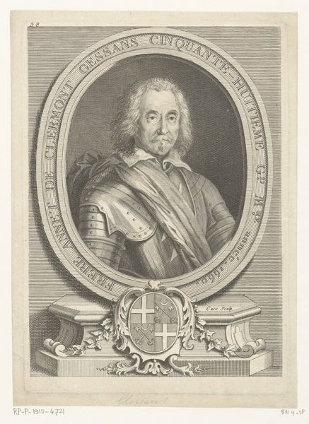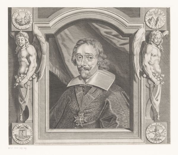 Curator: Looking at this striking engraving, Cardinal Jules Mazarin, crafted by Robert Nanteuil around 1660, it's the level of detail that grabs me first. A really fine example of Baroque portraiture, currently housed at the Metropolitan Museum of Art. What's your initial read? Editor: Imposing! There's an immediate formality about it. The textures in the drapery, the detailing on the face... it's a carefully constructed image of power. He’s framed, almost trapped, by symbols and inscriptions. Curator: Absolutely, the frame itself bears an inscription: "PACEM CVM LUMINE MITTVN... MAZARINVS CARDINALIS", meaning "Mazarin, Cardinal, sends peace with the light". You see it reinforced in the surrounding cartouches displaying lilies, references to Sorbonne, wreaths of laurel leaves, and a wheel inside another wreath on the right. There is a constant reminder to Mazarin’s office and high importance within society. Editor: And those symbols carry a heavy weight. The fleur-de-lis traditionally signal French monarchy and its connection with faith and legitimacy. They evoke a strong sense of French identity and power projection. That declaration of sending ‘peace with light’ almost reads as propaganda now, knowing the tumultuous times and Mazarin's rather divisive political moves. Curator: Indeed, the lilies’ presence is especially potent considering Mazarin’s complicated relationship with the French populace, despite his role in solidifying French power. In visual imagery, such symbols become rallying points and cultural shorthand, intended to resonate with an audience familiar with their historical meanings. They invoke, persuade, justify. The artist would be making deliberate connections between this one man and historical continuity of rule. Editor: Making this more than just a portrait. The frame transforms it into a political statement, influencing the subject's public image in 17th-century France. How much of it do you feel truly reflects the man versus the carefully crafted role? It feels less about capturing personality, and more about enforcing status, and maintaining an impression of authority. Curator: That friction between person and persona is, perhaps, what makes such portraits endlessly fascinating, isn't it? That continuous translation of power, reputation, into lasting artistic representations. Editor: Precisely. This is about presenting a facade, ensuring that the right message endures beyond the man himself. Quite a compelling lens through which to view both Mazarin's life and Nanteuil's artistic choices.