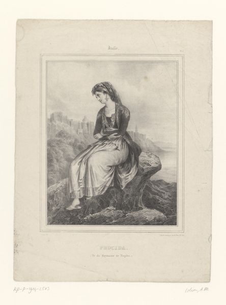 Editor: This is Alexandre-Marie Colin’s “Portrait of Mademoiselle Clara-Stéphany as Célanie in the vaudeville L'Île des Noirs," from 1823, rendered in pencil. The texture is stunningly delicate, and there's a quiet stillness about the piece. What do you see when you look at it? Curator: Initially, the interplay between line and shadow strikes me. Notice how Colin uses hatching and cross-hatching to define the volume of Clara-Stéphany's dress and the rock she sits upon. The texture created through the variation of pencil strokes. Editor: It’s amazing how he achieves such a luminous effect with just pencil! The way the fabric drapes seems so realistic. Curator: Indeed. Consider how the dress’s texture contrasts against the smoothness of her face and hands. What purpose might this intentional disruption serve in our comprehension of form? It brings the figure into focus in comparison to the relative environment around the sitter. Editor: I guess it guides your eye right to her… and highlights her status, maybe? Curator: Perhaps. Notice the simplicity of the landscape, and the composition's dependence on contrasts of light and shade and, the subject is captured against this backdrop in a structured configuration with careful control of linear details that create visual form to the extent they appear to the eye. Editor: It's fascinating to see how much can be conveyed through such a restrained medium. Curator: Absolutely. It underscores the artist's mastery of form and the emotive potential embedded within compositional elements. This approach moves beyond mere representation. I find this a great case for Romantic era artwork. Editor: That's a fantastic way to look at it. I hadn't considered it in terms of its intrinsic form rather than solely representation. Thanks!