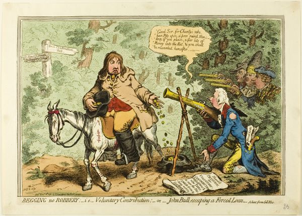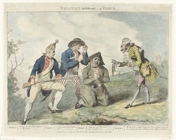 Curator: This print by James Gillray, called "Preliminaries of Peace," dates to around 1801 and uses aquatint, etching, and colored pencil on paper. It seems like quite a scene – what jumps out at you? Editor: It's busy! There's a lot happening. I notice the caricatured figures, especially the large one with his arms raised, and the military figure stepping precariously across a beam. What do you see in this piece? Curator: Gillray’s caricature, especially when considered alongside the work of someone like Hogarth, reveals a fascinating tension. While on the surface this is humorous political commentary on the short-lived Peace of Amiens, we have to consider the work within the context of revolutionary anxieties in England at the time. Note how Gillray deploys visual language and stereotypes to not just satirize but also potentially dehumanize. What’s your take on the central figures' postures? Editor: I see. The large figure on the left seems to represent England, maybe John Bull himself, in a rather unflattering way, celebrating, while the other character – is that supposed to be Napoleon? – looks almost manic as he leaps forward. Is Gillray commenting on the instability of the peace, perhaps? Curator: Exactly! It's worth thinking about how these caricatures play into existing political anxieties. Note, too, how loaded the term "liberty" was in this moment; are these figures marching towards freedom or are they endangering the very foundations of England's own liberty and stability? Consider what symbols are included – for instance, what might Gillray be implying with the precariousness of the ‘Heart of Oak’? Editor: That makes sense. I didn't think about how fraught the idea of 'liberty' was during the Napoleonic Wars. Looking at the smaller figures following, they seem like they are led blindly toward the edge. I now see it less as a celebration of peace, but as a cynical statement about the leaders leading the country toward destruction. Thanks, that was a lot to consider! Curator: And hopefully you now realize that satire is much more complicated and politically charged than simply humor. There are social power structures in play. Keep that in mind!