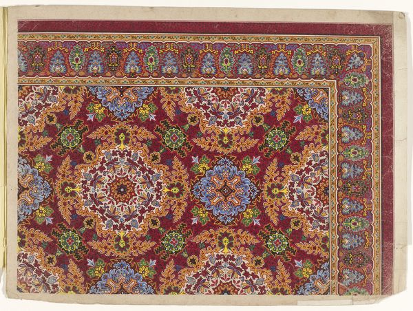 This is a carpet design of unknown date, made by an anonymous artist. The design uses a palette dominated by deep reds, punctuated by floral motifs in white, yellow, and green, alongside geometric patterns in the corners. The absence of a known artist invites us to consider the cultural conditions and histories of labor embedded in textile production. This design is a cultural artifact reflecting a long and complex history of trade, appropriation, and cultural exchange. Carpet designs often carry deep cultural significance, communicating narratives and histories through symbols and motifs. The emotional dimension of this design lies in its ability to evoke feelings of warmth and comfort. However, it’s also worth considering the stories of those whose labor may have been involved in the actual production of carpets based on designs like these. The design prompts us to reflect on the personal and collective histories woven into such objects.