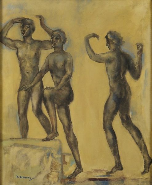Ossip Zadkine made this painting, called "The Fight," with some kind of paint, maybe gouache or casein, and paper. The colours are muted, like faded frescoes, all greys, browns and whites, and the figures are outlined with dark contour lines like stained glass. The material aspect of the work is all about layering, pentimenti, and ghostly repetitions; Zadkine’s process is like slow archaeology. The shapes are rounded, monumental, they recall classicism but they are also a bit off, like a dream. Look how the raised arms of the figures echo and overlap, creating a sense of motion and instability. The fight seems less about aggression, more about struggle and effort. This piece reminds me of the work of Marsden Hartley, especially his figurative paintings. Both artists grapple with the representation of the body, creating forms that are both powerful and vulnerable, caught between abstraction and figuration. Art is never fixed, always an echo of a feeling.