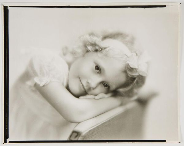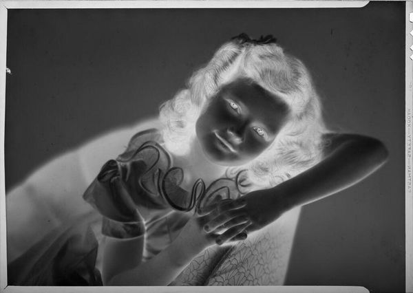 Editor: This is C. Bennette Moore's "Untitled (Eugenie Stoll)," a vintage photograph. The inverted tones create an ethereal, almost haunting quality. What strikes you most about the formal composition? Curator: The stark contrast in tonality is certainly arresting. Observe how the light delicately traces the contours of the subject's face and clothing. This emphasis on line and form abstracts the figure, moving it beyond a simple portrait. Editor: So, you're focusing on the visual language itself, the interplay of light and shadow? Curator: Precisely. The formal elements create a visual tension, a dynamic interplay between presence and absence. The image demands a reading that transcends mere representation. It invites contemplation on the nature of photographic representation itself. Editor: I hadn't considered that interplay before. It really changes how I see the image. Curator: Indeed.