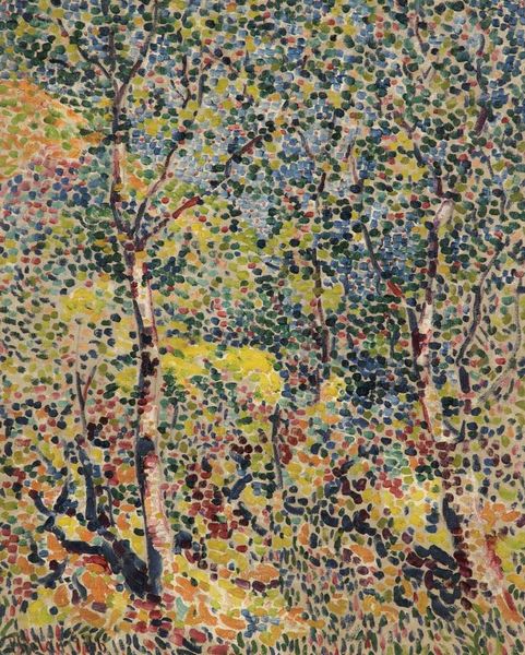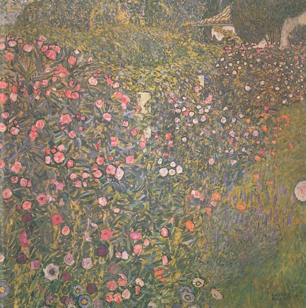 Editor: Here we have Gustav Klimt's "Roses Under the Trees," created in 1905, with oil paint. At first glance, I'm overwhelmed by this sea of green and these little explosions of color, especially the roses! What symbols do you see in this piece? Curator: Klimt’s landscapes, such as this one, reveal a deep dive into the symbolic language of nature. Consider the rose – historically a symbol of love, beauty, and transience. But Klimt reduces it to almost pure color, a visual echo within the larger tapestry of the leaves. Do you feel that flattening diminishes its symbolism, or perhaps amplifies it? Editor: I think maybe both? I still see the rose as representing beauty, but its repetition throughout feels like it’s part of something bigger, like it is representing life itself. Curator: Exactly! Now, observe the seemingly endless field of leaves, each one a daub of color. Do you sense a connection to pointillism, and perhaps even earlier, to tapestry traditions? Klimt merges figure and ground here, creating an all-encompassing field. There's almost a lack of perspective, wouldn't you agree? Editor: Yes, definitely. The lack of clear perspective almost feels like the painting could go on forever beyond its frame. Curator: That infinity, that embrace, reminds me of the "hortus conclusus," the enclosed garden, often associated with the Virgin Mary, and a space for both contemplation and secret rendezvous. Do you think Klimt may have intended a similar implication with his dense imagery? Editor: That is an interesting association. I learned something new and it's incredible how images through time carry these rich layers of cultural significance! Curator: Precisely. And hopefully, a lasting memory too.