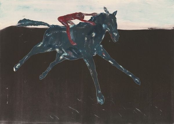 Curator: I am struck by the raw energy in this image, the horse practically leaping off the paper. Editor: Agreed. Let’s contextualize what we are seeing. This is Xu Beihong’s "Galloping Stallion" from 1937, an ink and color on paper piece that’s part of his iconic horse paintings. Curator: What is remarkable is the simplicity of the materials. Paper and ink, and yet such dynamism! I find myself wondering about the kinds of brushes he might have favored for a piece like this. Did he use different brushes for the body versus the mane? The contrast suggests distinct choices were being made regarding the mark-making. Editor: The horse became a potent symbol in Chinese art during this period. Xu Beihong, a prominent figure in modern Chinese art, often used the horse to represent the spirit of the Chinese nation – its strength and resilience, especially during a time of conflict and upheaval. Curator: I'm interested in how that ties into artistic production more broadly. It makes me think of how the demand for nationalistic imagery influenced workshops and the kinds of materials that were accessible at that time. Were there constraints on material access or pressures to produce particular patriotic symbols? Editor: Certainly. The rise of nationalism influenced patronage. Wealthy individuals and institutions who also championed Chinese strength supported the artist and these projects. It goes beyond just the availability of ink and paper, encompassing who was commissioning, collecting, and displaying these pieces. It influenced art criticism as well; critics were often invested in bolstering nationalist narratives. Curator: Exactly! The museum infrastructure itself—what got shown and lauded, what got excluded or overlooked—becomes part of the story. "Galloping Stallion," as we see it now, is more than a horse—it is a statement that existed inside that matrix. Editor: And through studying his work, the artist became forever entwined in the identity of a powerful movement that forever changed the means, motives, and meanings behind material culture.