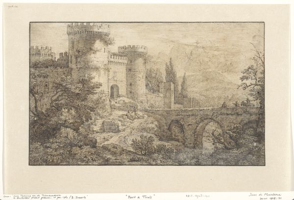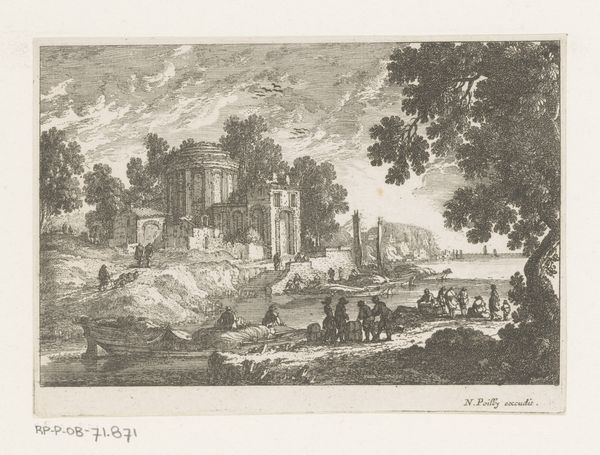 Editor: This etching, "Stadspoort bij een Italiaanse haven" by Jan Vincentsz. van der Vinne, created in 1686, depicts a city gate by an Italian harbor. The scene feels almost dreamlike, the detailed lines creating a hazy, almost melancholic atmosphere. What stands out to you in this piece? Curator: The etching's enduring quality stems from its embrace of certain symbolic tropes related to idealized memory and journey. Look at the gate itself, not just as an architectural feature, but as a symbol of transition, a threshold between known and unknown. The crumbling nature hints at the passage of time, layering history upon the scene. Do you notice how the figures are placed within the landscape? Editor: I see them! They are pretty small, almost like afterthoughts. Curator: Exactly. Their scale relative to the architecture reinforces a sense of human insignificance against the grand sweep of history. It evokes a particular response--a shared consciousness. Even the light serves the cultural memory aspect here. Note the contrasts, where some elements, like the figures clustered near the base of the archway, occupy darker, shadowy spaces, creating pockets of narrative, prompting the viewer to engage more closely. Editor: So, you're saying even the little details, like where the light falls and who is in it, all work together to create this mood? Curator: Precisely! Each element is a conscious choice that draws from a rich, visual vocabulary to transport the viewer. We see beyond a simple depiction of a harbor; we witness an artistic reflection of longing and place. Editor: That is more than meets the eye, I see it now. Thank you for helping to unpack the multiple meanings of the artwork, it gives me a better grasp of Baroque landscape as well.