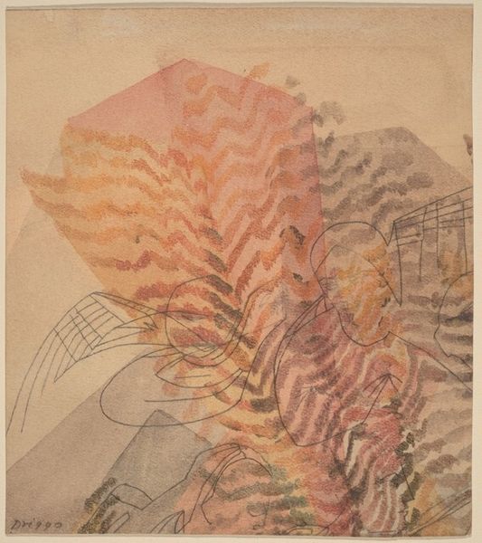 Curator: This is John Marin's "Echo Lake District, Pennsylvania," a watercolor from 1916. What's your immediate reaction? Editor: Ethereal. It feels like a memory, almost dissolving before you can grasp it. Watercolor’s perfect for that elusive quality, wouldn't you say? Curator: Absolutely. Marin often used watercolor to capture fleeting moments, the dynamism of the landscape. In its historical moment, think about how this type of abstraction reflects a move away from the established traditional approaches and styles, to engage modern ways of perceiving space and representing the landscape. Editor: Dynamism is key. See how he avoids hard lines? Instead of meticulously rendering trees or water, he suggests them with these bursts of color. It's like he’s painting the feeling of being there, the energy of the place. Makes you wonder what 'Echo Lake' sounded like. What kind of conversations did the surrounding landscapes have at the time? Curator: Marin was deeply influenced by modernism, particularly Cubism and Futurism. Look at how he fractures the landscape, presenting multiple perspectives simultaneously. This challenges the traditional notion of a static, unified viewpoint. And by this, of course, he joins an ever-expanding catalogue of artists questioning that perspective and representing more modern realities. Editor: The almost playful use of zig-zags, scattered amongst more traditional and romantic watercolor techniques...I'm strangely comforted, a visual warm blanket for my senses. Do you think his emotional state informed his choices, the colors? Curator: Undoubtedly. Artists operate within their personal and social contexts. Knowing the rise of American Modernism at the time helps inform our reception of the piece, and Marin was looking toward Europe even in representing Pennsylvania, yet this is filtered through a very unique artistic lens. Editor: That lens definitely gives the landscape an abstract poetry. Almost a dream, fading away at the edges of consciousness. I will never think about Pennsylvania landscapes the same after this, even as the colors may literally fade in real life. Curator: Well put. It makes us see the familiar anew. Editor: Precisely. It’s less about accuracy, more about authenticity. An impression on the surface for longer than perhaps imagined.
