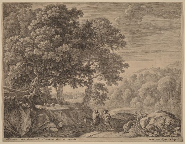 Editor: Here we have Matthäus Merian's "Konijnenjacht bij Bazel", created around 1625. It's a wonderfully detailed engraving. The eye is immediately drawn to this enormous, overshadowing tree in the foreground and the leisure scene beneath it. How does a piece like this resonate in its time, or even now? Curator: Considering the socio-political landscape of the early 17th century, this engraving offers a glimpse into the privileges afforded to certain classes. Hunting, as depicted here, wasn't just a sport; it was a marker of social standing. These scenes were carefully curated, reinforcing a narrative of power and leisure. Do you notice how the figures are placed within this vast landscape? Editor: I see how the tree seems to be framing them, almost legitimizing their position, or suggesting harmony. Curator: Precisely. The image operates as a social commentary, reflecting and perhaps even reinforcing the status quo. Landscape, genre painting – they’re intertwined here to project a certain ideal. The printmaking process itself, allowing for wider distribution, played a key role in disseminating these ideas. What audience do you think Merian was targeting? Editor: Presumably other privileged individuals who would have understood and perhaps even participated in similar activities? Curator: Exactly. And beyond that, consider how images like these shaped perceptions, created aspirations. It’s not simply about documenting reality, but about constructing it. A potent function of art and visual culture that extends even into our contemporary moment. Editor: It’s interesting to consider the way these historical genre scenes informed cultural values. Thank you! Curator: Indeed. It's a reminder that art doesn't exist in a vacuum. Looking at these through social history, we start questioning not only what we see, but why.