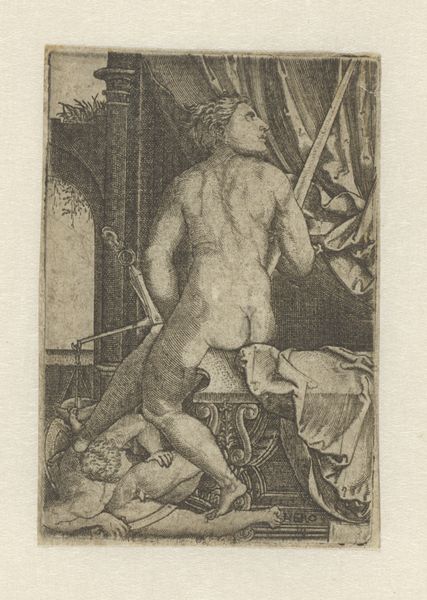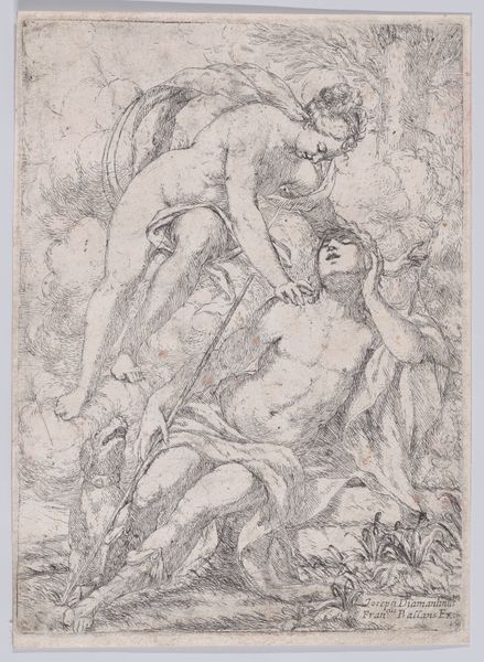 Editor: Here we have Giuseppe Scolari's "Saint Mary Magdalene in Penitence," created sometime between 1590 and 1607. It's an etching, giving it this intricate, almost shadowy quality. I'm struck by the vulnerability conveyed, but also a strange stillness amidst what must have been quite a turmoil. What do you make of the depiction and the socio-political forces at play here? Curator: Indeed, it’s fascinating to consider. Scolari's image arrives during the Counter-Reformation. The Magdalene was being reshaped as a symbol of repentance, used to promote contrition within the populace. The somewhat eroticized portrayal, though ostensibly about religious awakening, highlights how female figures often became sites of struggle between religious doctrine and societal desires. The etching itself, as a print, enabled wider dissemination of such potent imagery. Editor: So the medium, etching, enabled wider circulation of religious messaging... but also potentially amplified conflicting views about female sexuality and penance. Curator: Precisely. Note, too, the theatrical setting – almost stage-like. Where would this kind of image most likely be viewed at this time? Editor: Perhaps in private collections as well as printed devotional images used in the public sphere? Curator: Exactly. Consider, too, the almost casual placement of the Magdalene's attributes, her alabaster jar overturned. This imagery challenges you. Is she genuinely repenting, or is there something else being displayed and exploited? Such tensions fuelled the Baroque. Editor: It's unsettling how this seemingly devout image can reveal those underlying currents of power and control. Curator: Art always exists within such negotiations. Editor: Food for thought. Thanks! Curator: My pleasure. Always ask "Who benefits from this image, and how?" That reveals much.