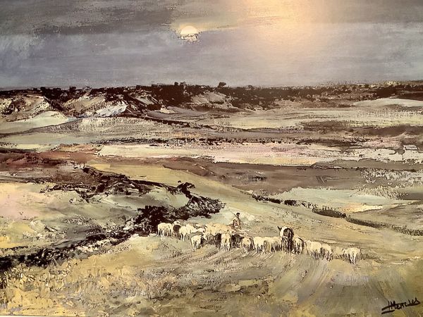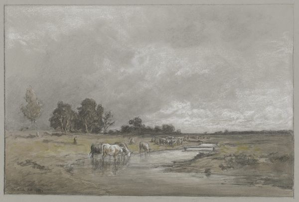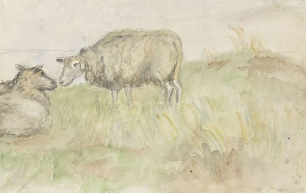 Editor: This watercolor on paper, “Castilian Landscape,” was created by Jesús Meneses del Barco in 1972. The muted tones create a somber, almost melancholic atmosphere. There's a shepherd with his flock, seemingly small against the vast, undefined space. What do you see in this piece, beyond the surface level? Curator: I see a subtle commentary on labor, land, and identity within the context of Francoist Spain. The subdued colors and the indistinct figures of the sheep and shepherd speak to a kind of homogenization, perhaps a suppression of individuality characteristic of the regime. Do you notice how the landscape seems to swallow the figures? Editor: Yes, it’s as if the landscape is indifferent to their presence. The blending of the shepherd and the sheep might imply a loss of personal identity or agency, maybe a struggle within oppressive systems. Curator: Precisely. The "Castilian Landscape" is not just a scenic view; it is an embodiment of the sociopolitical tensions of the time. Meneses seems to be engaging with the tradition of landscape painting to make a poignant statement about marginalization and the silent resistance inherent in everyday life. The muted colors also echo the limited freedoms and constrained expression. Editor: That makes so much sense. It's easy to see landscape paintings as purely aesthetic, but this piece really pushes me to think about the social messages art can carry, even quietly. Curator: It urges us to consider how artists can embed critical perspectives within seemingly conventional forms. Thinking about how identity can be impacted by these external oppressions helps to contextualize and discover meaning within "Castilian Landscape." Editor: I will definitely look at landscapes with new eyes!