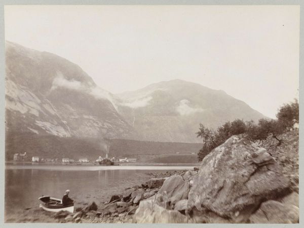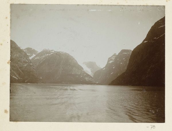This photograph of a ship at sea, set against a backdrop of snow-capped mountains, was taken by Paul Güssfeldt sometime between the mid-19th and early 20th centuries. It comes to us through the relatively new medium of photography, which by this time was being used both for artistic expression and scientific documentation. The photograph itself, while seemingly straightforward, involved a complex interplay of chemistry and optics. Light-sensitive materials were carefully prepared and exposed, then developed through a series of chemical baths to reveal this captured image. The tones, muted sepias, are characteristic of early photographic processes. While this artwork doesn't obviously speak to labor or class, it's important to remember that even the act of producing this photograph involved skilled labor and access to specialized equipment. The photograph offers us a view of the world, mediated through both human skill and industrial processes. It reminds us that even the most seemingly straightforward images are imbued with social and cultural significance.