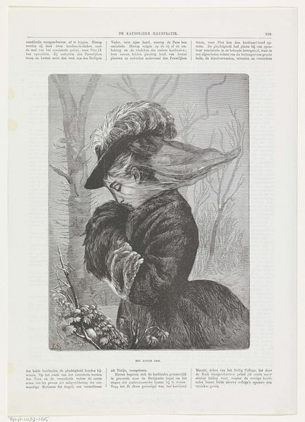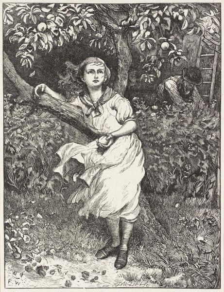 Curator: This is "Spring Days," an engraving by the Brothers Dalziel after a work by Frederick Walker. Editor: It’s incredibly dense, almost claustrophobic. The heavy blacks give it a somber, rather than springtime, feel. Curator: Walker, who died quite young, was associated with the aesthetic movement and the revival of wood engraving. This was for a popular magazine, and the Dalziels were master engravers. Editor: But the dark tones…are we meant to see these young women as burdened, perhaps by societal expectations? The girl in the foreground seems almost trapped by the thicket. Curator: It's interesting you read it that way. I've always seen the density as reflecting the abundance of nature in spring. The image was meant for mass consumption, so the themes would not have been radical. Editor: Perhaps, but even popular art can subtly reflect the constraints placed upon women's lives at the time. It is good to consider the politics of imagery in a piece like this. Curator: Well, it certainly offers a lot to consider, even beyond its historical context. Editor: Indeed. I am left thinking about how artists use nature to reflect social conditions.