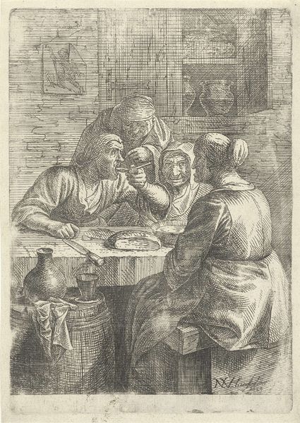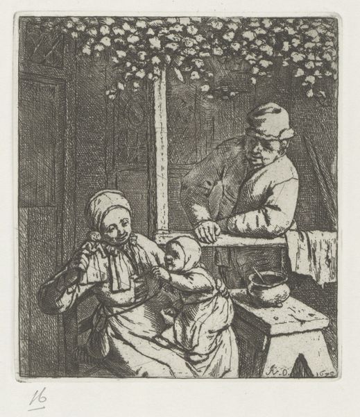 Editor: Here we have Adriaen van Ostade’s "Mother with Child on Lap Reaching for a Doll, a Man Looking On," an etching from 1679, held at the Rijksmuseum. The ink strokes create a really intimate scene, almost like we’re peering into a private moment. What stands out to you when you look at this print? Curator: This piece offers us a glimpse into the domestic sphere of the Dutch Golden Age, but it’s also ripe for interrogation. Ostade, while celebrated, depicted mostly peasant life. Whose lives are we really seeing reflected, and through whose eyes? How might the economic realities of the time shape our understanding of the family dynamics displayed? Editor: That's an interesting point. It feels very…everyday. The figures seem caught in a candid moment, yet the artist’s choice to portray working-class life raises questions about representation and social commentary. Curator: Exactly! It's crucial to examine the context. Etchings like these were accessible to a broader audience. What narrative is being perpetuated, and who benefits from it? Consider the woman: her role appears solely maternal. How does this reinforce societal expectations of women during that period? Editor: It's unsettling to think how this image may contribute to societal expectations or gender roles of the time. But maybe it's an accurate reflection? Curator: Reflection, yes, but also construction. By understanding the power dynamics at play in 17th-century Netherlands, we can have an enlightening view of social expectations about the family. These images both reflect reality, and constructed a norm for how things "should" be. Editor: Thinking about art in this way gives me so much more to think about. Thank you for shedding some light on these aspects of societal expectations on these etchings! Curator: Absolutely. Art is never created in a vacuum; it's always in dialogue with its context, so by analyzing it, we can start to build meaningful dialogue about historical inequalities and the impact those have had on us.