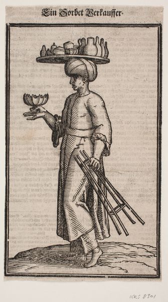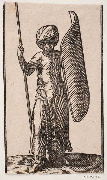 Curator: Look at this striking figure! The piece is entitled "Standing Soldier with Curved Shield" by Melchior Lorck, created in 1582. It’s rendered in ink on paper using the woodcut technique. Editor: There’s something profoundly melancholy about him. The stark lines and contrasts give a very strong and brooding feeling to the portrait. The broken tower suggests ruins or loss. Curator: Absolutely, I see your point. It's fascinating how Lorck, during a time of considerable political and religious upheaval in Europe, used the visual language of military prowess to convey a complex, perhaps even mournful, narrative. He might have been representing shifting geopolitical tensions of the period, especially in Northern Europe. Editor: The symbols speak of more than simple militarism, though. Note the peculiar helmet, the exotic curve of the sword – elements that might identify him as a type rather than a person, maybe as a symbol of the dangers on Europe's borders? Curator: Indeed. The choice of attire and weaponry certainly suggests the artist’s knowledge of non-European military garb. Remember that, at this time, the Ottoman Empire was still a powerful force and source of anxiety for many European nations. The image can be regarded as a representation of Europe's perception of the Other. Editor: The tower or obelisk adds another layer. Ruined, it becomes an emblem of lost glory, of empires and cultures passed. Placed behind the armed figure, we sense time weighing heavily on both man and civilization. The way he stands there almost in wait contributes to that feeling. Curator: Considering the historical context and the prevailing cultural anxieties, Lorck created a powerful emblem. His subject serves as a constant reminder of both vulnerability and resilience. Editor: For me, beyond historical concerns, he embodies something eternal about humanity – always armed, always watchful, always shadowed by the ghosts of the past. Curator: A haunting and very perceptive reflection, which captures the complexity of Lorck's work perfectly. Editor: Yes, it leaves you with plenty to think about.