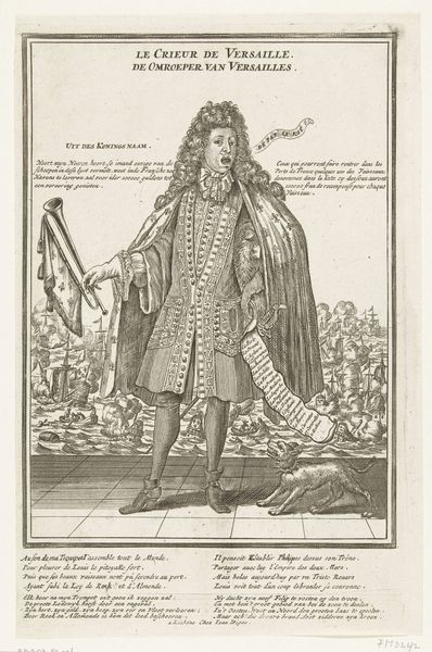 Editor: Here we have an engraving titled "Omroeper van Versailles," or "Town Crier of Versailles," created in 1692. The artist is currently listed as anonymous and it's currently located at the Rijksmuseum. It depicts a man making an announcement with ships and explosions in the background. There’s a dramatic feeling, even comical, about the figure with the dog looking on. What do you see in this piece? Curator: Well, right away I am struck by the way this image serves as a cultural record. The town crier wasn’t just delivering information; he was embodying the power of the monarchy. Consider the bell he holds: it is a clear symbol, a visual cue to capture immediate attention. But look at the backdrop too—what might those warships signify, culturally? Editor: Perhaps the announcements have to do with naval conflicts or trade? It’s easy to overlook that detail initially because of the central figure. Curator: Exactly! Notice the scroll he holds, detailing names of those complicit. Doesn't this engraving feel staged, in a way? Every element is carefully placed to convey a message. How does this relate to a wider Baroque trend? Editor: I can see that—it seems to glorify power with this central figure towering above the chaos in the background. Almost like political theater, if you will. Curator: Political theater indeed! It speaks volumes about how information was disseminated and controlled. Thank you for bringing that perspective to the table! Editor: Thank you. I never thought about the theatrical presentation of information like this before!
