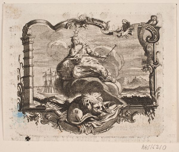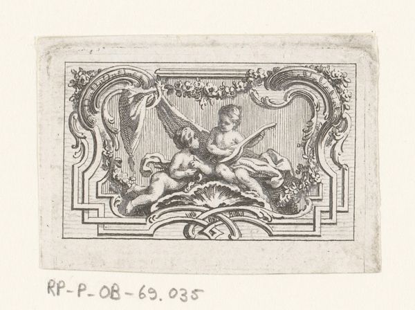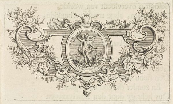 Editor: So, this engraving, "Putto op adelaar," from sometime between 1738 and 1749, by Gabriel Huquier. The precision of the line work is just incredible. What I find really striking is the way the artist contrasts the smooth skin of the putto with the sharp, detailed feathers of the eagle. What stands out to you in this piece? Curator: Considering Huquier’s context, think about printmaking’s role. These engravings were often commissioned reproductions, not unique art objects but commodities facilitating the dissemination of images, ideas, and styles throughout Europe. Note the inscription: it clarifies Huquier's involvement with the commercial aspects of print production beyond mere artistic skill. Editor: Interesting, so you’re saying this wasn't necessarily about artistic expression, but more about mass production and distribution? Curator: Precisely. Consider the materials. The paper itself, the ink, the printing press: all products of labor and integral to understanding this object. We're not just looking at an image; we’re examining a piece of visual culture shaped by specific production techniques and social needs. The decorative frame further suggests its function as part of a larger system of ornament and interior design available to the wealthy consumer. How might this change your perception of its artistic value? Editor: It shifts the focus, I suppose, from individual genius to collaborative craftmanship and the market it supplied. The skill is still impressive, but it's in service of a different kind of artistic intention, like creating visually appealing reproducible items. Curator: Exactly. Understanding these historical and material processes, including how labor and capital intertwine, challenges us to rethink traditional art historical values centered solely on authorship and aesthetics. We're looking at material culture in action, with consequences for society. Editor: It's a good reminder that even seemingly simple images can be a reflection of the social and economic realities of their time. Thanks for pointing that out. Curator: My pleasure. Every artifact speaks volumes if we examine closely not only the image but also the how and why it came to be.