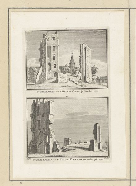 Editor: Here we have Hendrik Spilman's "Two Views of the Ruins of Brederode Castle," an engraving from between 1752 and 1792. It’s striking how these stark ruins are presented, almost like portraits of a forgotten history. What symbols do you see present in this work? Curator: Well, immediately, the ruins themselves are potent symbols. Buildings, particularly castles, often represent power, stability, and permanence. The fact that this castle is in ruins, depicted in two different states, speaks volumes. Consider the cyclical nature of power – how civilizations rise and fall, how even the most imposing structures can crumble over time. Does it make you think about the human impulse to build, to leave a mark? Editor: It does, it’s a bit melancholic, that even the strongest powers are vulnerable. I hadn’t considered that. So the artist included two images – is that significant, symbolically? Curator: Precisely! The two viewpoints suggest a deeper meditation on the passage of time. It's not just a snapshot, but a comparison, perhaps implying the ruins have changed between when the original drawings were made and the engraving was done. It also suggests looking at history from multiple perspectives, recognizing that there's never just one way to interpret the past. The building nestled among the ruins in the upper image provides another symbol, highlighting human resilience in the face of decay. Editor: So it’s not just about what's lost, but about what endures, or transforms. That building becomes a powerful little emblem in this reading. Curator: Exactly! The symbols interact to tell a layered story about time, power, and continuity. These kinds of landscape prints were popular during that period and acted as a form of cultural memory and often a subtle social critique. Editor: That's a fresh take; it really underscores how much meaning can be packed into what seems like a simple landscape image. Thank you. Curator: It was my pleasure; these ruins definitely have more to say.
