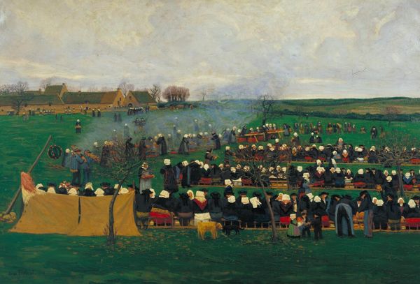 Editor: This is Hans Smidth’s "Fur marked," painted sometime between 1860 and 1900. It’s an oil painting, and viewing it, I am struck by the flat, almost panoramic composition. What can you tell me about it? Curator: I see in this piece a direct connection to the labor and economy of 19th-century Denmark. Smidth is not simply representing a market scene; he is depicting the intersection of rural life, commerce, and the very land that sustains them. How does the artist employ the materiality of oil paint itself to evoke this relationship? Editor: The oil paint looks like it was applied in layers, suggesting the build-up of materials at a marketplace? What's the significance of plein-air technique in this work, especially given the subject matter? Curator: Painting en plein air isn’t merely about capturing a landscape; it is a direct engagement with the environment, mirroring the farmers’ and merchants’ dependence on the natural world. Notice the raw, unidealized representation of the landscape itself. This is not romanticized scenery, but a depiction of the physical reality that underpins the economic activities taking place. Think about the artist making the art work versus farmers selling their agricultural works and livestock. How does that relate? Editor: So the technique becomes part of the narrative, emphasizing the real conditions of production and exchange in this period? I hadn’t thought of it that way before. Curator: Precisely! Smidth's focus is on recording the evidence of labor and commerce that's right in front of them in Denmark at the time, instead of lofty narratives of nobility or myth. His method of using material makes the historical scene into something else. This work pushes back the boundary between artwork and craft! Editor: So, looking closely at the process and materials really opens up the work to broader historical questions. Thank you for that insightful observation! Curator: It’s a reminder that art doesn't exist in a vacuum; it is made by someone with physical actions, sold, and consumed in cultural and economic systems.