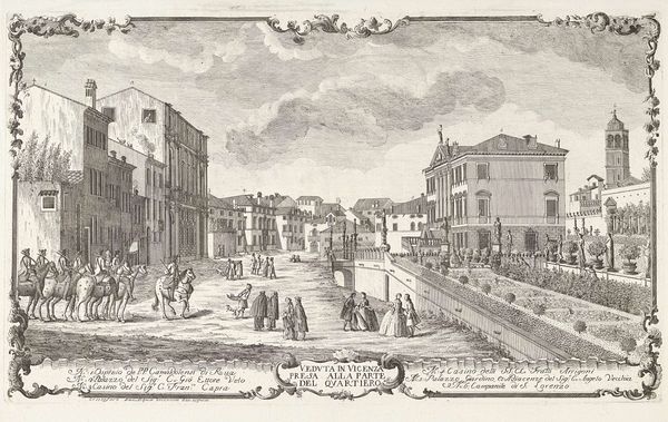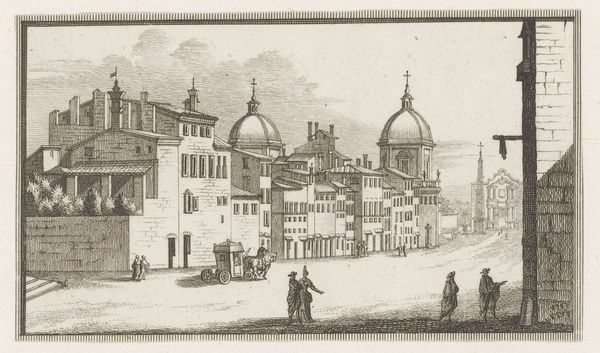 Curator: What do you see in Michele Marieschi's "Porta Magna van het Venetiaans Arsenaal" from 1741? It's a drawing, a print, rendered in pen and engraving, now at the Rijksmuseum. What captures your eye? Editor: It’s quite detailed for a pen sketch. The number of figures, the ships in the background... It feels very much like a moment captured in time, but also grand, almost staged, because the eye is drawn to the gate. I'm curious, how should we interpret such a detailed cityscape from this period? Curator: Think about Venice at this time. The city was a major power, but facing increasing competition. This gate, the Porta Magna, wasn't just an entrance; it was a symbol of Venetian power and maritime dominance. The inclusion of the ships is key here; this isn’t just about aesthetics, it’s about demonstrating naval strength. And it is rendered with incredibly delicate marks made by the pen. Editor: So, it’s like propaganda, almost? This powerful gate, filled with these statues... The artist uses it to reinforce the might of Venice? Curator: Exactly. Marieschi is not merely depicting a scene, but carefully constructing an image of Venice's identity. The social and historical contexts, how Venice wanted to be seen versus its reality, those are crucial. Consider too, who commissioned this piece? What message were they trying to convey about Venetian society and its role in the world? Editor: It's fascinating to think of art as this subtle form of political messaging. I hadn't really considered how deliberate these cityscapes could be. Thank you, I am seeing so much more here now! Curator: Indeed. Looking closely at the symbols and historical context in a work is a great tool of visual analysis and helps expose the many stories the artist has to tell.