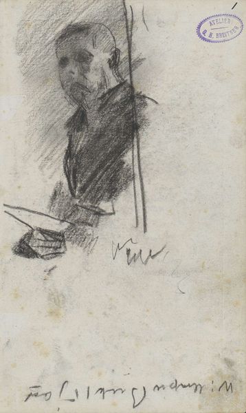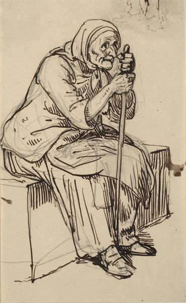 Editor: This is "Orphan Man with Top Hat, Drinking Coffee," a pencil drawing made in 1882 by Vincent van Gogh. There’s a feeling of both dignity and weariness about him; it’s quite poignant. What strikes you about this work? Curator: Indeed. This drawing is brimming with symbolic tension. Van Gogh captures not just a man, but a figure burdened by societal constraints. Consider the top hat, traditionally a symbol of bourgeois respectability. Yet, here it sits atop a figure labeled an "orphan," hinting at a fall from grace or an imposed marginalization. The act of drinking coffee is likewise intriguing. Editor: How so? It seems like such an everyday action. Curator: Precisely! Coffee was becoming increasingly accessible to the working class in the late 19th century, suggesting a degree of assimilation. But does it truly offer solace, or is it merely a momentary escape? Note also the man’s medal; it is a subtle assertion of former standing. Does this point toward pride or past glories? Editor: I see. So, it’s less about what’s depicted and more about the context behind these visual cues. Curator: Precisely. Consider the heavy lines used for the coat. The clothing becomes almost like armor or a cage. It highlights social expectation, which then allows the viewer to become self-reflective: how free are we? Van Gogh provokes contemplation about visible status versus lived experience, what someone projects outwardly versus their interior existence. Editor: That's fascinating! I hadn't considered how each element plays such a crucial symbolic role. Thank you! Curator: My pleasure. It reveals how a simple drawing can reflect far more than what's on the surface, no?