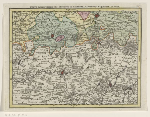 Curator: This detailed map is entitled "Kaart van de Zuidelijke Nederlanden," or "Map of the Southern Netherlands," made sometime between 1721 and 1774, created as a print or engraving by Johannes L. van Luchtenburg. Editor: The fineness of the lines and the almost obsessive level of detail, even without vibrant colors, suggests authority and precision. It seems intent on communicating very specific information about this territory. Curator: Maps in this period were indeed powerful tools, both aesthetically impressive and deeply enmeshed in politics. They helped define territories, assert ownership, and shape national identity. Think about who the intended audience would be, who would be purchasing such a map and how they might use it. Editor: That makes me consider the symbolism here: boundaries so clearly drawn. Borders become performative acts of power in rendering the lines—what is left *out* of this depiction. Who decided what to include, and why? Curator: The "Southern Netherlands," primarily correspond to what is now Belgium, so the map illustrates a contested space caught between larger European powers, mostly Catholic regions formerly ruled by Spain. It appeared at a critical juncture, amidst ongoing conflicts and shifting alliances, and depicts not only geography but also the ambitions of empires. The printing medium itself would allow dissemination and reproduction to wider audiences who desired a sense of this place. Editor: Thinking of audience and dissemination brings into view the issue of accessibility. Who *could* read the labels, who could understand the complex delineations—what did it mean to produce such an ostensibly detailed image for consumers who are probably primarily elites? Curator: These kinds of details certainly point to this print serving a complex symbolic and practical function at the time it was released, influencing the political imagination. Editor: Ultimately, engaging with art history can inform not only an understanding of an artwork such as this, but also the historical milieu. Curator: Precisely, prompting us to reflect critically on how geographical depictions can perpetuate social, cultural, and political ideologies in both the past and the present.