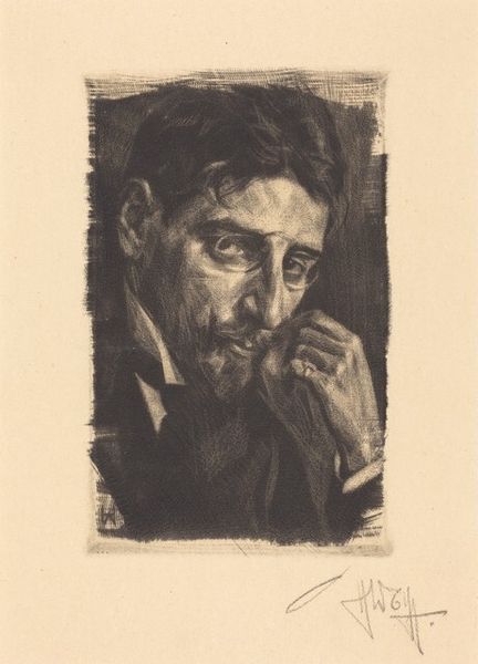 Curator: Welcome. Let's spend a moment contemplating this "Self-Portrait" from 1880 by Carl Bloch, currently residing in the Statens Museum for Kunst. The artist worked with etching on a print to make this image. Editor: My initial reaction is one of shadowy intensity. The darkness surrounding his face really forces you to lock eyes with the artist. There's a piercing quality to his gaze. Curator: Precisely. Bloch's self-representation holds a strong symbolic resonance. He seems to intentionally utilize the contrast between light and dark. Look how his face emerges from a sea of shadow. His sharp facial features suggest determination, possibly even a spiritual calling. Editor: I find that interesting, especially if we think about his historical context. Bloch was, of course, working within a Danish art world increasingly wrestling with social issues. Does his "spiritual calling," as you say, reflect, perhaps, a sense of responsibility he felt towards his community and towards championing the disenfranchised? Was the art scene in turmoil at the time? Curator: That is indeed one valid interpretation. The iconography here also suggests a degree of introversion, a delving into the self. It's a classic trope of artistic self-portraiture: The artist as seer. I imagine he intended the darkness to speak for a world he may have rejected, not that which needed his calling to justice. Editor: Maybe it’s both. Artists are rarely simple in their motivations, but perhaps he’s presenting a more ambiguous portrait of a man divided between internal contemplation and a need to engage with the external world. Think about how he used Christian images during Denmark's most transformative years: religious art for his culture’s development. Curator: A productive thought. He may also present himself in the throes of intense inner thought to show his devotion to the truth in line with Kierkegaard. Either way, there is little doubt that Carl Bloch has invited us into a profound psychological space. Editor: It's a powerful reminder that portraiture is not just about likeness; it is about conveying character, particularly one struggling in the time it occupies. I appreciate Bloch for compelling us to delve deeper than skin deep. Curator: Absolutely. And it underscores how much our own present-day reading can continue to enliven these older images. Editor: Agreed. Art constantly regenerates!