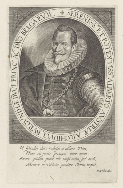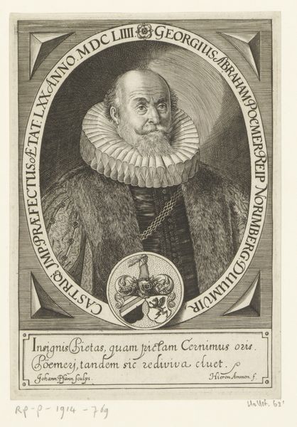 Georg Hipschmann created this portrait of Sigmund Gabriel Holzschuher at age 67 using engraving techniques in the year 1632. The composition is dominated by the circular frame enclosing Holzschuher's likeness, which creates a sense of containment and focus on the subject. The artist has employed a meticulous linear style, evident in the detailed rendering of Holzschuher’s garments and facial features. The contrasting textures of the fur coat, the crisp linen ruff, and the smooth skin are all carefully articulated. The presence of heraldic symbols and inscriptions around the portrait serve as signs, encoding Holzschuher's identity, status, and familial lineage within a visual language that would have been immediately decipherable to its contemporary audience. The elaborate symbolic system challenges fixed meanings, instead engaging with historical and cultural contexts. Note the formal qualities of line and texture which function beyond aesthetics, playing a role in the encoding of meaning within the historical context of the artwork's creation.