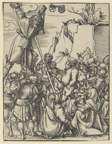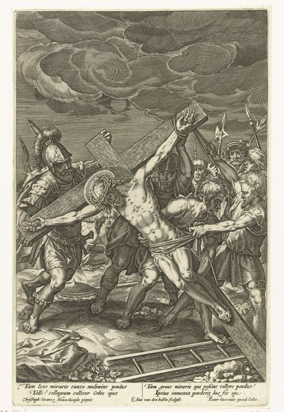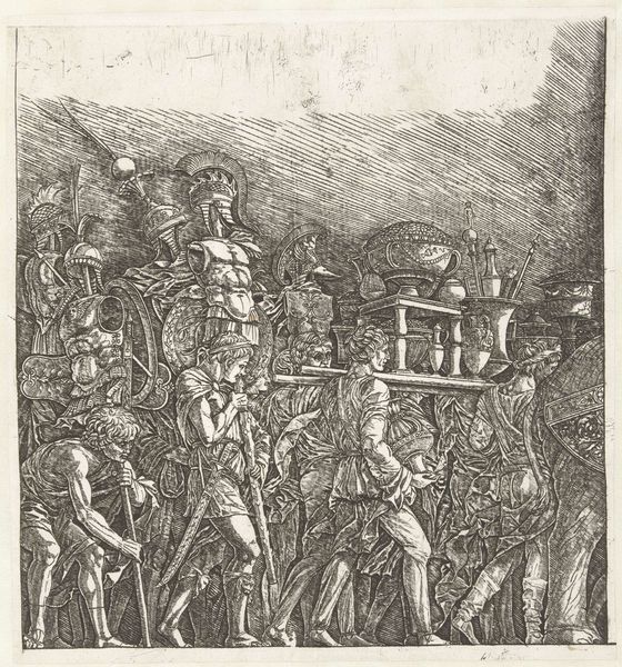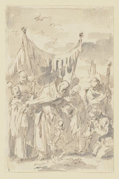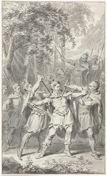 Editor: This is "Moord op de Germaanse veldheer Arminius, 19" or "Murder of the Germanic Commander Arminius, 19" by Jacobus Buys, created between 1779 and 1784. It's a pen and ink drawing currently held at the Rijksmuseum. There's such dynamism and violence depicted with fairly simple means. What stands out to you in this piece? Curator: I am immediately drawn to the materiality of this work. Buys uses readily available and relatively inexpensive materials: pen, ink, and paper. What social context allows for the production and, crucially, the consumption of a work depicting the assassination of a Germanic commander? Editor: That's an interesting point. The story it tells, combined with the starkness of the pen and ink medium, gives it a sense of immediacy. Is he challenging high art conventions by not choosing oils? Curator: Precisely. This isn’t some grand history painting in oils meant for a palace. This is a drawing, a reproductive print perhaps, meant for a broader audience, using materials available to a burgeoning middle class. Consider the labour involved - Buys or his workshop, replicating these for distribution. It democratizes access to historical narratives. Does the use of ink alter our understanding of 'value' within the artistic market of the time? Editor: It seems like it challenges the notion of art as purely a luxury item. It suggests a purpose beyond just aesthetic appreciation. What do you think Buys was trying to achieve through the mass distribution of this image and the use of inexpensive material? Curator: Perhaps a dissemination of Enlightenment ideals or the popularization of historical narratives for national identity formation. It underscores the socio-political agency an artwork can have. It’s about access and the message, conveyed efficiently via these humble materials. Editor: It’s amazing how a simple pen and ink drawing can unpack so much about social context and accessibility of art in the late 18th century. I didn't expect to view this artwork through this perspective. Curator: Indeed, the materiality of art holds immense potential to enhance our knowledge regarding cultural significance, manufacturing and modes of consumption.