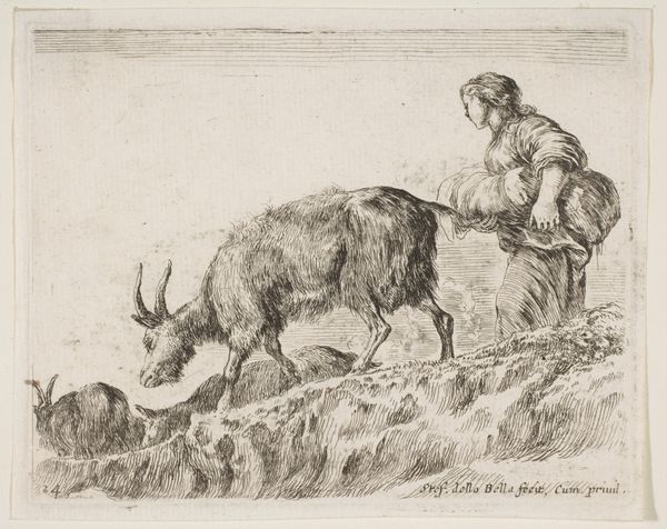 Editor: So, this is "Plate 13: a peasant woman..." an etching by Stefano della Bella, from between 1639 and 1649. It depicts a woman walking with animals in tow; it's mostly the line work, but the animals are really expressive. What jumps out to you about this work? Curator: What I find striking is how this seemingly simple scene reflects broader societal structures. Consider the depiction of the peasant woman. How does della Bella portray her role in the social landscape of the time? Editor: She’s walking away from us, leading the animals, kind of blending into the landscape. Curator: Exactly. Now, let's think about the Italian Renaissance’s decline and the rise of the Baroque period. How does della Bella, an Italian artist working in print media, negotiate the representation of common people and labor for a presumably elite viewership? What does it mean to aestheticize rural life for urban consumption? Editor: I guess it makes sense that those in the city wouldn’t have contact with rural life unless it was romanticized, but I hadn't considered that. Curator: The print becomes a commodity, doesn’t it? Also, consider the power dynamics implicit in the artist's gaze – whose story is being told, and for whom? Editor: It’s interesting how much can be revealed about a culture by simply looking at everyday figures and animals through this lens. Curator: Indeed. The ‘everyday’ is always a construction reflecting very particular social relations. I find considering how artists, like della Bella, participate in or critique these constructions infinitely fascinating.