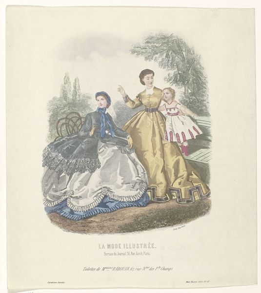Curator: This lithograph is from an 1859 issue of Journal des Demoiselles, a French fashion magazine. The artist credited is A. Portier. Editor: The first thing that strikes me is the careful arrangement of figures, creating almost a pyramidal structure within the print. The pale colors add to a dreamlike effect, almost as if they're floating. Curator: The clothing obviously signals social standing, but look at the positioning. The standing woman, the seated woman reclining with the child--it evokes traditional Madonna and Child compositions, doesn't it? Subliminally imbuing fashionable domesticity with that revered imagery. Editor: Absolutely, and there's a subtle play with texture here, from the stiff column to the wispy rendering of the shrubbery, each calling our attention to their unique surfaces, especially within the women’s voluminous skirts. Look how the artist plays with layering, shadow, and light to convey depth. Curator: Note, too, the repetition of the round form in the hairstyles, the puffed sleeves, echoing the ideal of feminine beauty as fertile, round, and gentle. It really serves to highlight the roles women are expected to play. Editor: Yes, and from a compositional standpoint, these repeating forms create a cohesive visual rhythm that keeps the eye moving smoothly across the scene. It's almost Baroque, even in its subtlety. Curator: Precisely, it’s that balance between highlighting an image's cultural messaging but without being obvious or vulgar that strikes me here. Almost as though these figures were suspended somewhere timeless and real. Editor: The careful arrangement of forms, textures, and light reveals a clear focus: the orchestration of elegance on paper, giving us not only information but an evocative aesthetic experience. A potent example of visual art, definitely, Curator: Indeed, it provides a lens through which we see their time period’s assumptions, subtly rendered. Editor: Leaving the eye lingering with questions as to just how beautiful this lithograph is, and for what end it seeks to address and show to others, I daresay.