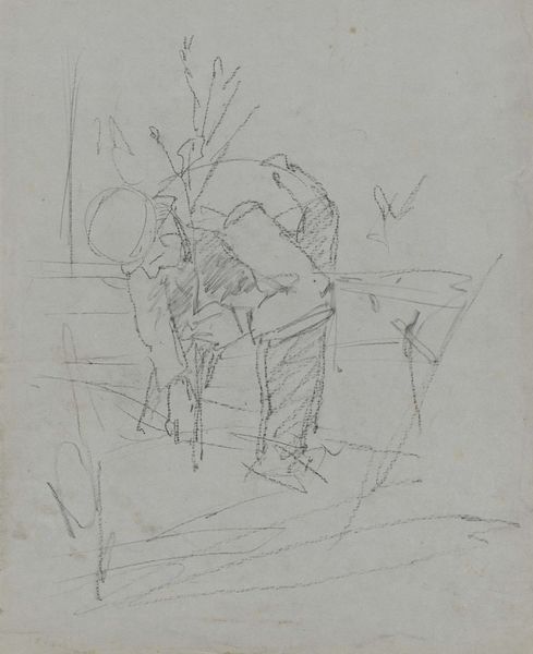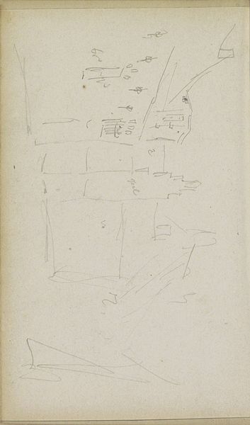 Curator: Well, here we have George Hendrik Breitner's "Boats Before a Building," created between 1880 and 1882, and currently housed here at the Rijksmuseum. It's a graphite drawing on paper. Editor: It looks incredibly raw, like a fleeting impression captured on the go. There’s a kind of structural dynamism despite the sketch-like quality, a real emphasis on the geometry of the boats and buildings. Curator: Absolutely, and that sketch-like quality speaks to the rapid industrialization of Amsterdam at the time. Breitner was known for capturing the city's evolving landscape, the labour that produced that, and this drawing provides a direct glimpse into that transformative process. It gives insight into how infrastructures such as canals become sites of labor, sites where wealth is extracted. Editor: I can see that. But even divorced from that social narrative, it’s a fascinating study in form and composition. Note the way he uses a spareness of line to create depth, layering the boats against the suggestion of a larger building behind. The artist reduces a complicated scene to just a few essentials. Curator: And those "essentials" reveal so much about the conditions of production. Consider the type of boats Breitner chooses to depict and the implications for trade. The artist certainly could be exploring class dynamics here by drawing this particular landscape, making particular marks with specific purpose in mind. Editor: But look at how the shapes themselves interact. It is about visual experience—the thrust of a diagonal line countered by the solidity of the blockier shapes. There’s a play of light and shadow even in the stark graphite, suggesting atmosphere with a masterful economy. The arrangement, at the end of the day, offers up a satisfying pictorial balance. Curator: Perhaps...but this satisfying "pictorial balance" wasn't just conjured from thin air. It reflects a very real, tangible, material reality for laborers at the time! It wasn't an easy balance for all involved in the making of the Dutch city... Editor: Indeed. I think that, despite our different takes, we can both appreciate how Breitner's choice of medium and stark execution conveys his interest in documenting the world in real time, whatever aspects of the scene interest you most. Curator: Agreed. It offers a powerful look into not only form but also function, the very engine of that period.