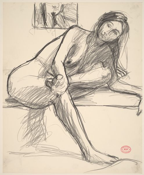 Editor: So, here we have Richard Diebenkorn's "Untitled," a pencil drawing of a seated nude, created sometime between 1955 and 1967. I find the pose so compelling; there's a sense of vulnerability but also strength in the stretch. What do you see when you look at this drawing? Curator: I see a dialogue between intimacy and public display, common in depictions of the nude. Diebenkorn places this figure, traditionally seen in private, within the very public space of art. But I'm drawn to the medium itself – pencil – it’s immediate, almost a raw nerve laid bare. Editor: Raw nerve is right. It feels so immediate and unfiltered. Curator: Exactly! The social context is also key. Mid-century America was grappling with changing views on the body and sexuality. The sketch format allowed Diebenkorn to present the figure without the rigid formality seen in academic nudes, questioning those older power dynamics inherent in the genre. Think about the institutions that held sway then, galleries, academies... they are now being challenged to widen perspectives and viewpoints. How do you feel this presentation challenges or confirms these conventions? Editor: It's less about idealizing and more about observing, right? The line is confident but not flawless, human even. Maybe that accessibility makes it feel contemporary. Curator: Precisely! This shifts power away from the idealized form – the academy, the patriarchy if you will – towards the artist's gaze, a more democratic interpretation, and in extension allows our own interpretation to become more important. Did it change how you perceived the drawing? Editor: Definitely, I see it now not just as a sketch, but almost as a social commentary. It's like Diebenkorn is inviting us to rethink the nude and its role. Curator: Absolutely. That interplay between artistic choice and social reflection really elevates the work.