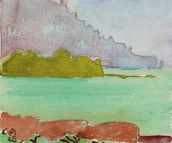 Otto Mueller made this painting, ‘Bathers by a Lake’, at some point in his life using oil on canvas. It’s all earthy tones, like browns and greens, and there’s this real sense of a laid-back process at work. You can tell he wasn’t trying to be too precious about it. The paint is thin, and the surface almost looks like it’s breathing. You can see the texture of the canvas coming through, especially in the figures of the bathers, which aren’t really trying to be super realistic. Look at how he’s painted the leaves, like quick dashes, full of movement. It’s like he's trying to capture the feeling of being in this space, rather than a perfect picture of it. There’s one mark that really grabs me, right above the head of the figure on the left; it's like a dark little bird in flight. Mueller reminds me a bit of Paula Modersohn-Becker, you know? That same interest in the body, and in nature, but with this slightly off-kilter feeling. It's like they’re both part of a conversation about how we see and feel the world around us.