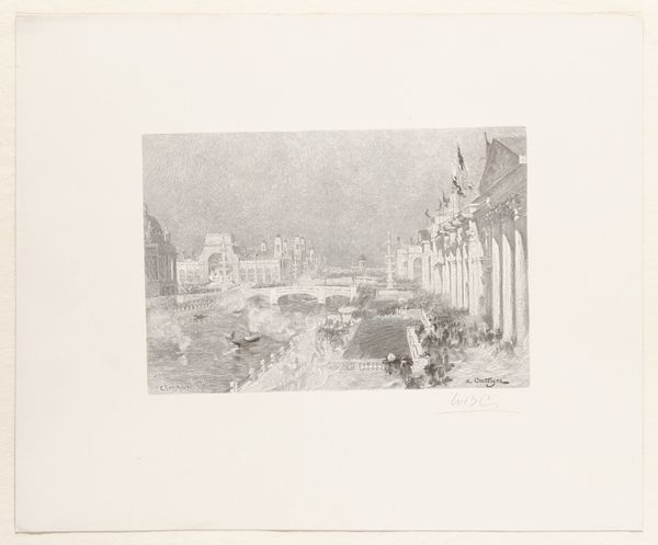 Curator: Here we have Conrad Ahrendts’ etching from 1889, "Riverbank with Boats and a Harmonica-Playing Boy". Made with paper as support, isn't it just marvelous how much atmosphere is packed in such a small format? Editor: It's utterly captivating. Melancholy washes over me looking at it; something about the dark, scratchy textures coupled with the wistful scene along the river...It feels so intensely lonely, romantic, and beautifully human all at once. Curator: I am so intrigued by how he presents a humble scene of music and leisure with such palpable technical skill. Take note of Ahrendts’ labor to generate mood with something that isn't that easily manipulated, an etching. How was Romanticism embraced by a mass market eager to own these intimate scenes? It reminds us of the commodification of yearning, in a sense. Editor: Right. It's easy to look at the melancholic mood and consider it detached. But it makes you think. Did they hear this tune? And where are their minds floating off to in those boats at the bank of the river? How interesting is that a scene that suggests people's dreams in an artistic print made by meticulous industrial work? Curator: Precisely. Romanticism’s focus on individual expression ironically made itself accessible for so many to internalize and replicate this very idea of self-discovery. An artisan then would produce pieces, and their craftmanship then served both to create AND circulate sentiments about inner expression to people. Editor: I guess one is inevitably shaped by the tools they manipulate in their artwork. It's almost humbling. Thinking about all of this labor just concentrated here, in an intimate artwork intended for contemplation. You begin seeing and listening differently, that's for sure. Curator: Well said! Perhaps our audiences will also carry with them an awakened, listening heart from now on.