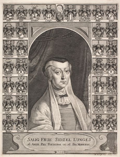 Editor: This engraving, "Portrait of Joanna the Mad, Queen of Castile," by Jonas Suyderhoef, was created between 1644 and 1650, using paper and a meticulous line technique. I’m immediately struck by the formal presentation, but there’s also an undeniable melancholic mood evoked by the sitter’s gaze. What do you see in this piece? Curator: Intriguing, yes. Ignoring the representational aspects for a moment, observe the elaborate frame and decorative elements surrounding Joanna. Notice how the artist employed compositional balance between organic motifs – foliage, flowers – with rigid heraldic emblems. The contrasting textures further animate the surface. What function does this dichotomy play? Editor: Perhaps it symbolizes the tension between her royal status and inner turmoil, reflected through decorative, structured versus free flowing elements? Curator: Precisely. It is key to consider how these formal choices construct meaning. Focus on Suyderhoef's precise execution and strategic distribution of light and shadow which gives depth to an otherwise flat medium, underscoring psychological intensity in a structured setting. It creates an undeniably powerful viewing experience. Do you think removing this frame would alter our engagement with the portrait itself? Editor: Absolutely! Without the framework, the portrait would lose a dimension. The stark contrast emphasizes Joanna’s figure while also highlighting the details in the setting and accessories of that period. Thanks! That has made me think about how much visual grammar affects how we feel and what conclusions we might draw. Curator: Exactly. And analyzing formal strategies provides tools for navigating these intricate systems of visual communication. It changes how you read a picture.
