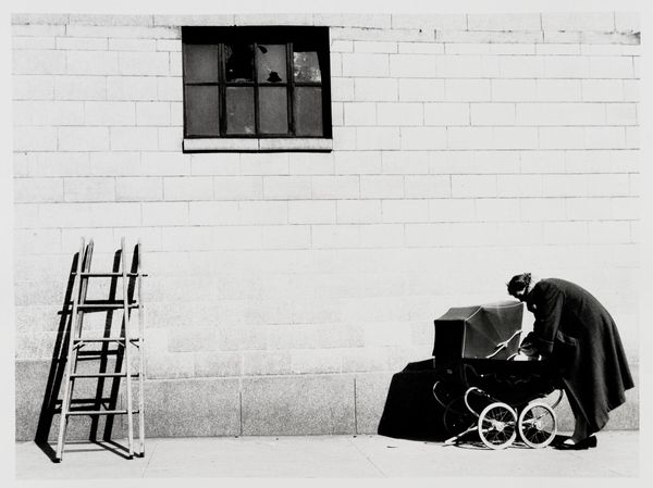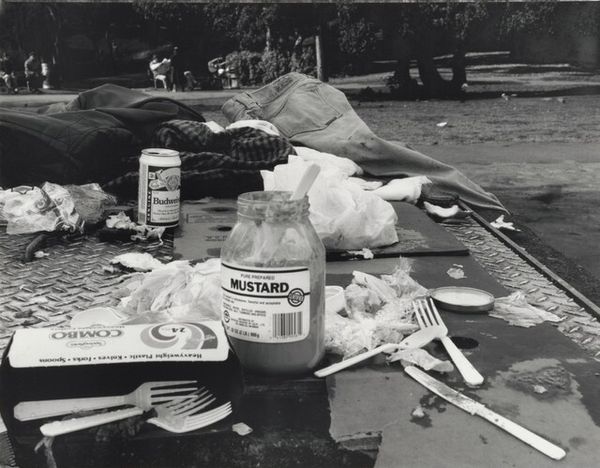 Editor: We’re looking at Jim Goldberg's "Hollywood Freeway #2" from 1989, a gelatin-silver print. The contrast between the intimate moment between the two figures and the blurred traffic zooming past creates a really striking juxtaposition. How do you interpret this work in terms of its social commentary? Curator: It’s precisely that contrast which gives the photograph its power. Goldberg, often working within the social documentary tradition, highlights social inequality. Look how the tenderness of that embrace is framed – almost trapped – between the relentless, uncaring flow of traffic and the detritus of discarded items. Consider what the location itself – the freeway – represents in Los Angeles' cultural imagination: mobility, opportunity, but also isolation. Editor: So the freeway, a symbol of freedom, becomes a barrier? Curator: Exactly! Goldberg uses the visual language of documentary photography, which gained prominence with photographers like Dorothea Lange during the Great Depression. It raises questions about who has access to that “freedom” and who is left on the margins, observing it. Where do you think this fits within debates around homelessness, so rife at the time? Editor: It almost feels like an indictment of the promises of progress, that those promises weren't equally distributed. The blur of the cars… they're going somewhere, but these figures are stuck. Curator: The photograph invites us to think about how cities are designed and who benefits from that design, or is excluded by it. Photography has a long history of both celebrating progress and exposing its discontents. It is worth reflecting on what part museums like ours play in perpetuating or subverting social inequality through the art they display. Editor: It definitely provides food for thought. Thanks for opening my eyes to those ideas. Curator: My pleasure. These photographs have the capacity to open discussions of what we take for granted when we understand the role of cultural consumption.