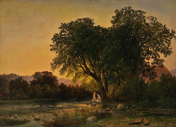 Gerard Bilders created this evocative oil-on-canvas painting, titled 'Woodland Pond at Sunset,' during the mid-19th century. Bilders employed traditional fine art materials, blending pigments with oil to capture the tranquil scene. Notice how the inherent qualities of oil paint – its viscosity, luminosity, and capacity for blending – allow for soft gradations of light and shadow across the canvas. Bilders masterfully uses these properties to depict the reflective surface of the pond and the dense foliage of the trees. Consider the labor involved in creating this painting. From the preparation of the canvas to the careful mixing of paints, each step required time, skill, and attention to detail. While the subject matter may seem idyllic, the painting itself is a product of human effort and creativity, reflecting the artist's engagement with the world around him. By focusing on the materials and processes behind the work, we gain a deeper understanding of its cultural and social significance.